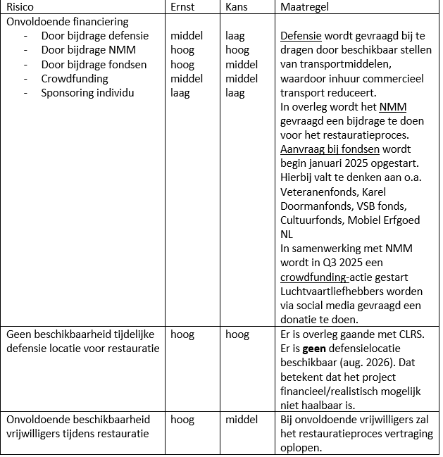 Na langdurig en gedegen onderzoek van betrokken partijen heeft CLRS (de luchtmacht) besloten niet in ons project te participeren (aug. 2025). Reden is dat men onvoldoende toezichthouders paraat heeft om dit proces tijdens opleiding te begeleiden ( ). Dit besluit heeft een enorme impact op ons project en kan mogelijk het einde betekenen. Wij moeten op korte termijn en geschikte lokatie vinden om in ieder geval de romp onder dak te brengen. Deze lokatie moet zodanig zijn dat er met passende beheersmaatregelen gewerkt kan worden met CMR stoffen zoals Chroom 6.