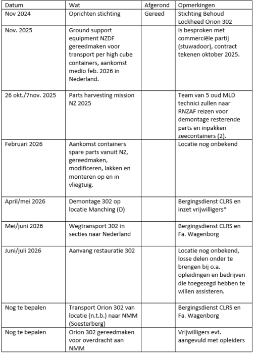 Tijdens een bezoek aan de Royal New Zealand Air Force (RNZAF) in augustus 2024 zijn al veel ‘missing spare parts’ die nodig zijn voor het verder opbouwen van de Orion 302 beschikbaar gesteld en voorlopig aldaar opgeslagen. Eind 2025 zullen deze per zeetransport naar Nederland komen.